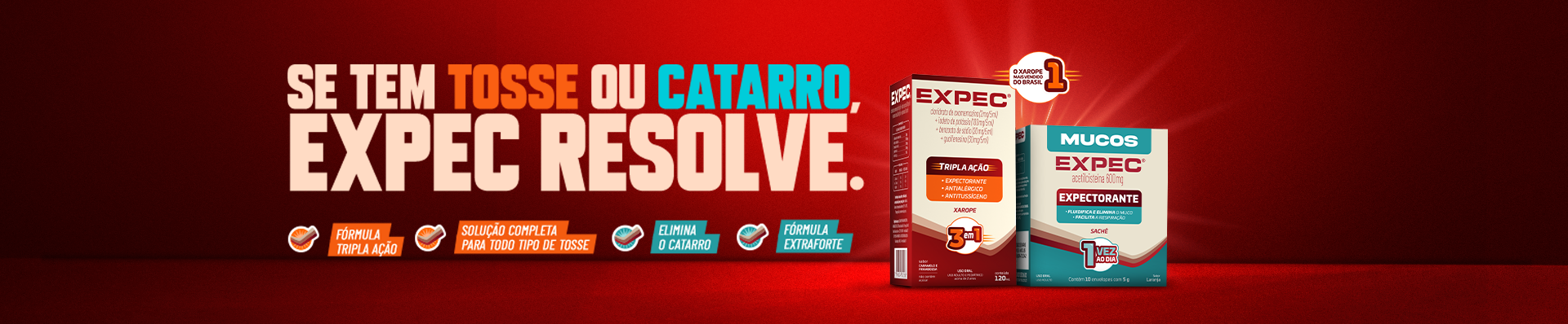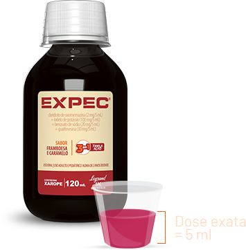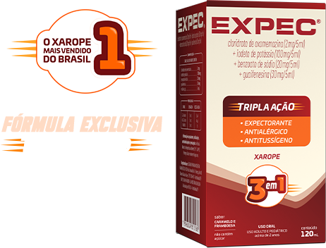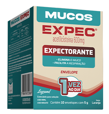EXPEC® (cloridrato de oxomemazina + iodeto de potássio + benzoato de sódio + guaifenesina) 2 mg/5 mL + 100 mg/5 mL + 20 mg/5 mL + 30 mg/5 mL. Xarope. Frasco com 120 mL. USO ORAL. USO ADULTO E PEDIÁTRICO ACIMA DE 2 ANOS DE IDADE. INDICAÇÕES: EXPEC® é indicado no tratamento sintomático da tosse (irritativa, não produtiva, espasmódica, seca) associada a várias condições respiratórias. Reg. M.S. nº 1.6773.0271. SAC: 0800 0500 600/mb- 640016-LEGRAND-v0/ SE PERSISTIREM OS SINTOMAS, O MÉDICO DEVERÁ SER CONSULTADO. EXPEC® É UM MEDICAMENTO. DURANTE SEU USO, NÃO DIRIJA VEÍCULOS OU OPERE MÁQUINAS, POIS SUA AGILIDADE E ATENÇÃO PODEM ESTAR PREJUDICADAS. MUCOS EXPEC® Acetilcisteína. MEDICAMENTO SIMILAR EQUIVALENTE AO MEDICAMENTO DE REFERÊNCIA. Granulado para solução oral de 600 mg. Embalagem contendo 4, 10* ou 16 envelopes de 5 g. *Embalagem fracionável ou comercial. USO ORAL. USO ADULTO. Este é um medicamento expectorante indicado quando se tem dificuldade para expectorar e há muita secreção densa e viscosa, tais como bronquite aguda, bronquite crônica e suas exacerbações (piora do quadro clínico e complicações), enfisema pulmonar (doença crônica caracterizada pelo comprometimento dos pulmões), pneumonia (inflamação nos pulmões e brônquios), colapso/atelectasias pulmonares (fechamento dos brônquios) e mucoviscidose (doença hereditária que produz muco espesso, também conhecida por fibrose cística). Também é indicado para intoxicação acidental ou voluntária por paracetamol. Reg. M.S. nº 1.6773.0691. SAC: 0800 050 06 00 / mb-385468-LEG-v1 / SE PERSISTIREM OS SINTOMAS, O MÉDICO DEVERÁ SER CONSULTADO. MUCOS EXPEC® É UM MEDICAMENTO. SEU USO PODE TRAZER RISCOS. PROCURE O MÉDICO E/OU FARMACÊUTICO. LEIA A BULA. *Em relação à Acetilcisteína de 200 mg. Julho/2025.